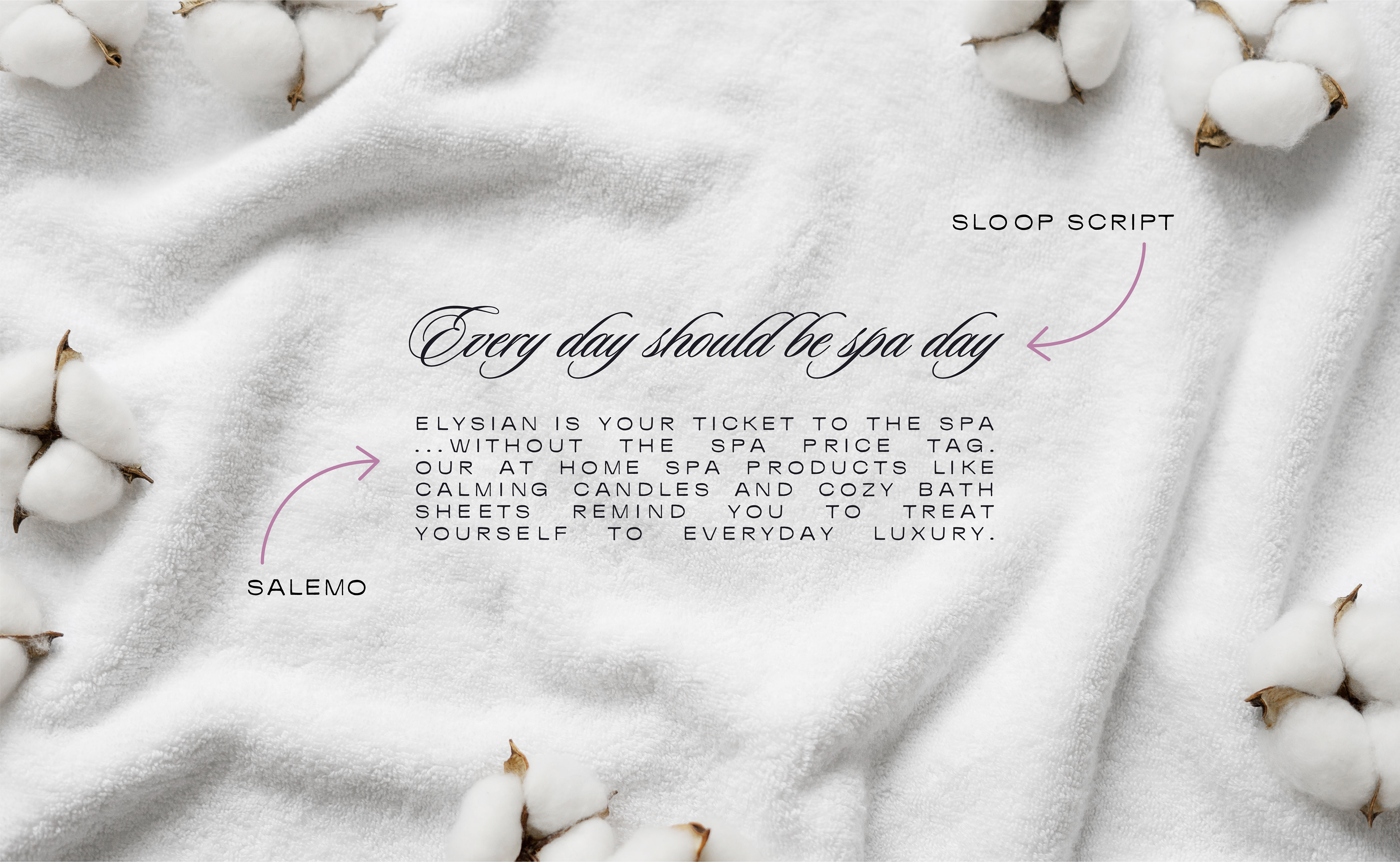 The goals for this branding were to create something elegant, modern, cheeky, minimal, and calming. In order to communicate the duality of the Elysian brand (they provide luxury products but they do it in a way that is accessible to everyone), I used two very different fonts: the script font Sloop Script communicates elegance and femininity and the hand-drawn sans serif Salemo font is more casual and relatable.I really wanted to steer clear of the overused blues, greens, and tans of the spa and at-home spa brands.
